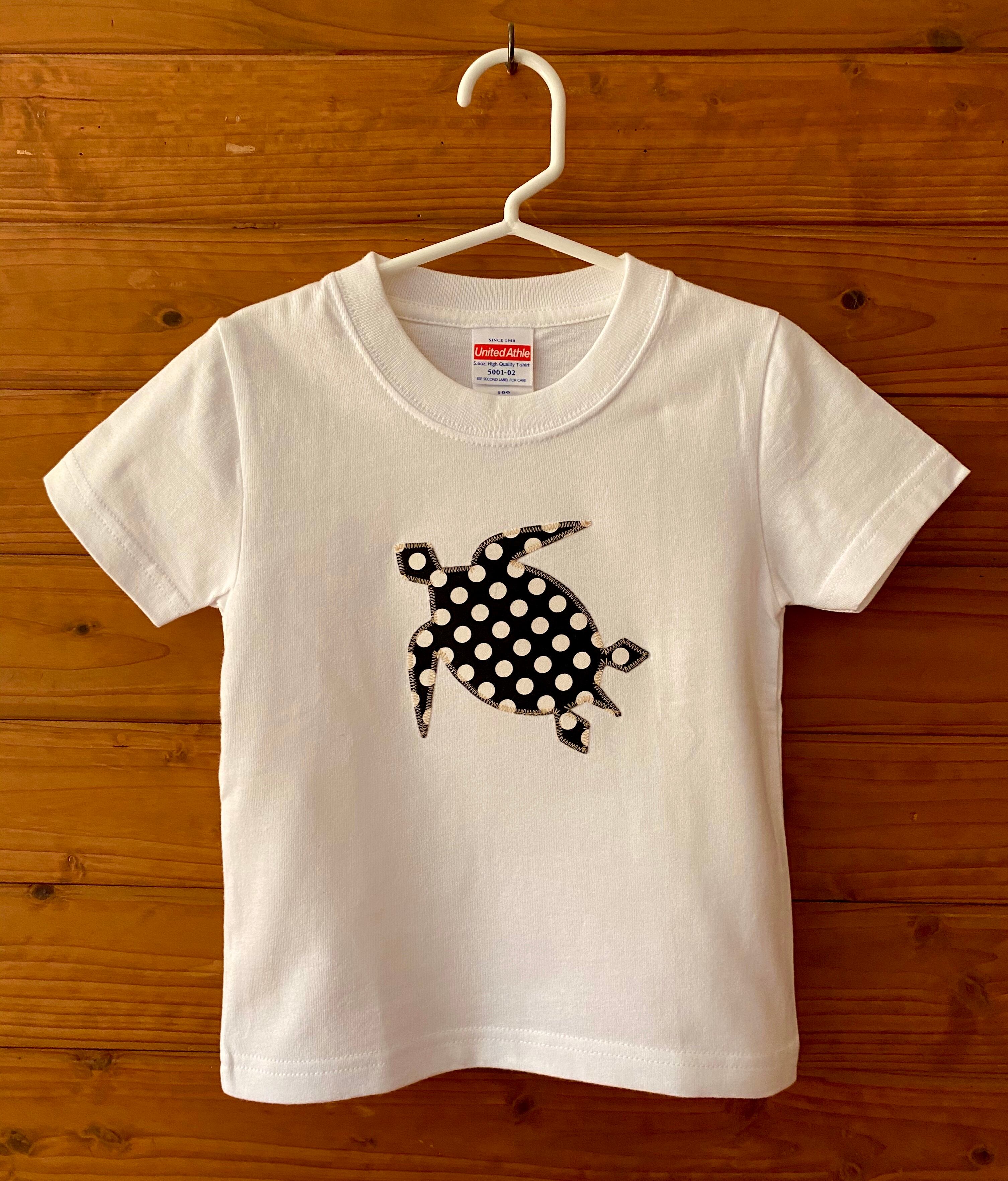 白地に黒と白のドット柄の海ガメアップリケkidsTシャツ!家族でお揃いコーデもオススメです。