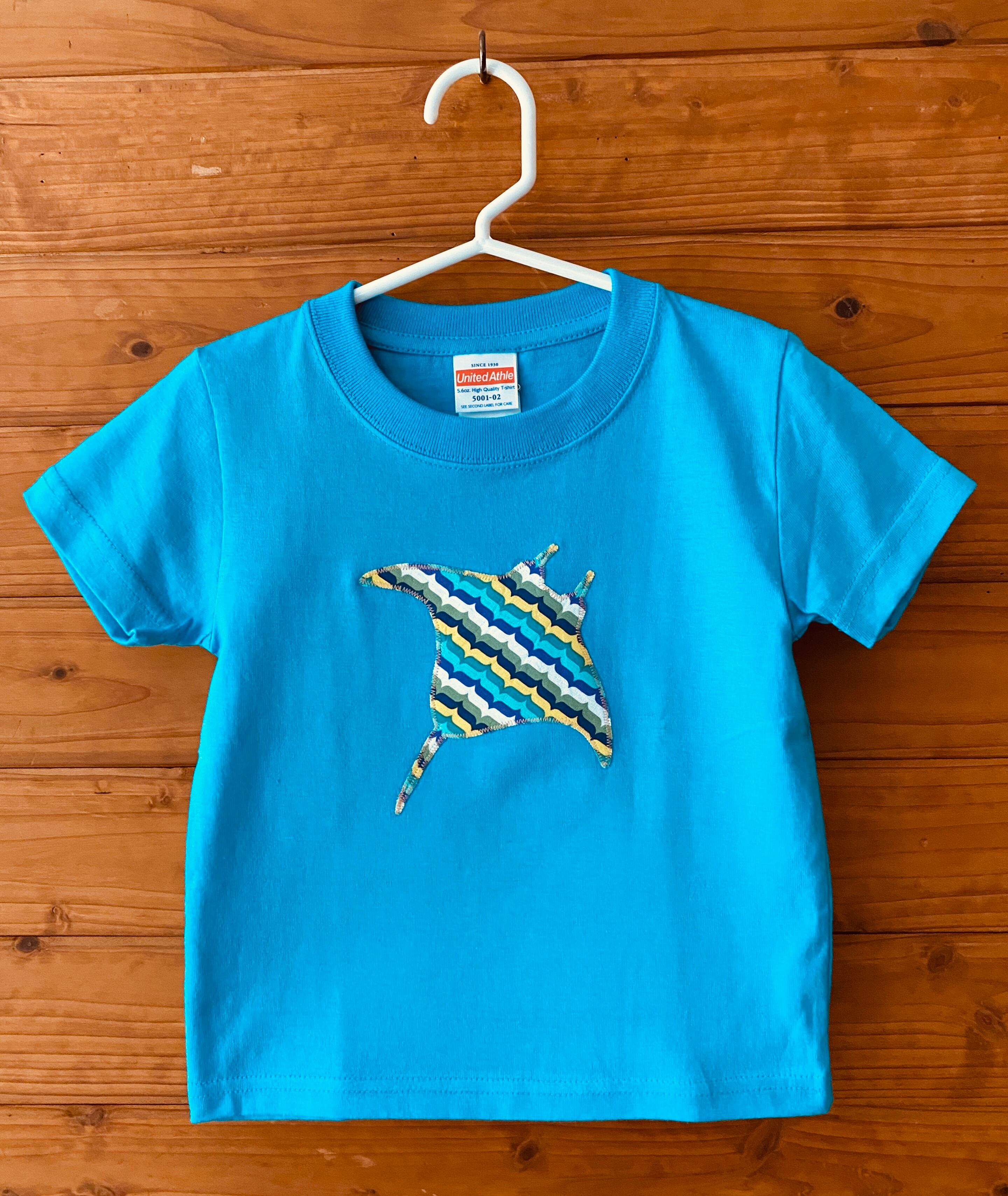 ターコイズ地にマンタ柄アップリケkidsTシャツ!家族でお揃いコーデもオススメです。